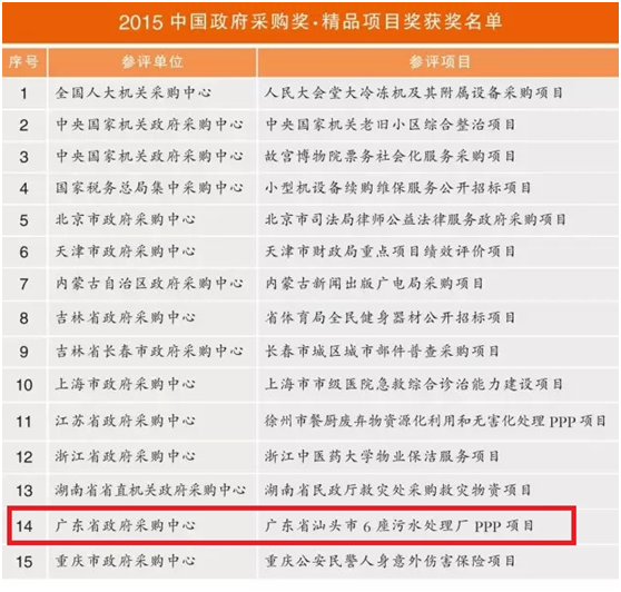 2015中国政府采购奖评选工作于日前完成🧢🤲🏻。根据《中国政府采购报》、中国政府采购新闻网公示的获奖名单显示,彩神1担任顾问的广东省汕头市6座污水处理厂PPP项目入选“2015中国政府采购奖·精品项目奖”。