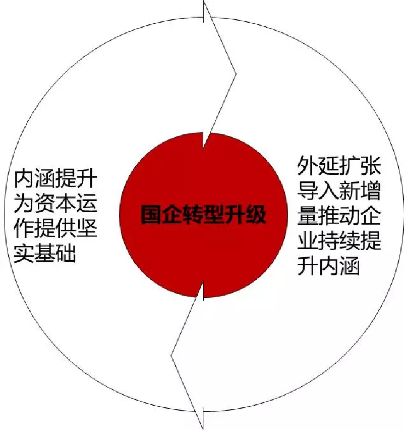 破解上述五方面难题有三种选择途径:1.内涵式提升。通过引入职业经理人、战略规划、业务调整、组织设计、制度优化等手段依次改善每个问题缓慢推动国企转型升级;2.外延式发展🛃。通过借助资本市场的力量迅速开展投资并购等资本运作拓展业务领域进入新产业🔵,以增量化解存量问题👩‍❤️‍💋‍👩🐋;3.结合式互动。不断提升企业治理水平🎑,与此同时基于企业的产业战略展开外延式资本运作🌡。