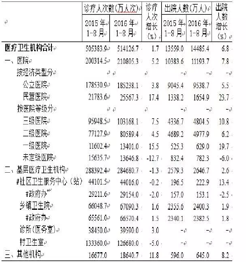 2016年1-8月,全国医疗卫生机构总诊疗人次达51.4亿人次,同比提高1.7%3️⃣。其中:医院21.1亿人次🥍,同比提高5.2%;基层医疗卫生机构28.5亿人次🧘🏻♂️,同比降低1.3%;其他机构1.9亿人次⏩。