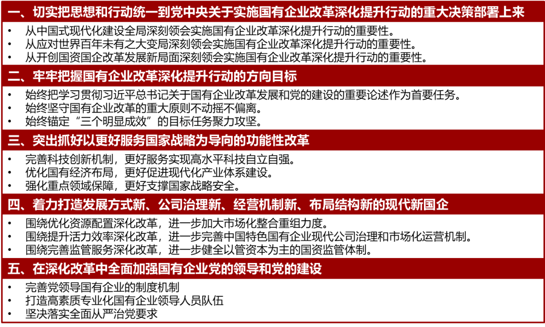 之后,2023年10月,《深入实施国有企业改革深化提升行动》公开提出深化提升行动的五大任务: