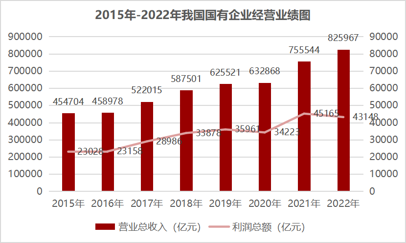 从经营数据来看,我国国有企业年营业收入由2015年的454704亿元增长到2022年的825967亿元,实现了营业总收入持续稳步增长的目标,复合年增长率约为8.9%。利润总额总体看来保持上升态势。