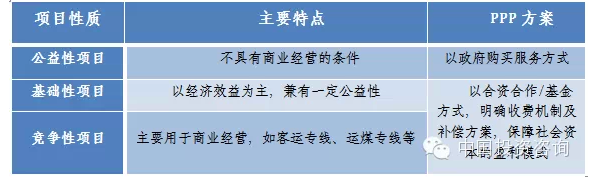 按铁路项目的建设经营的性质分类,主要可以分为公益性、基础性和竞争性三类,可考虑采取不同的PPP方案,主要分类如下表: